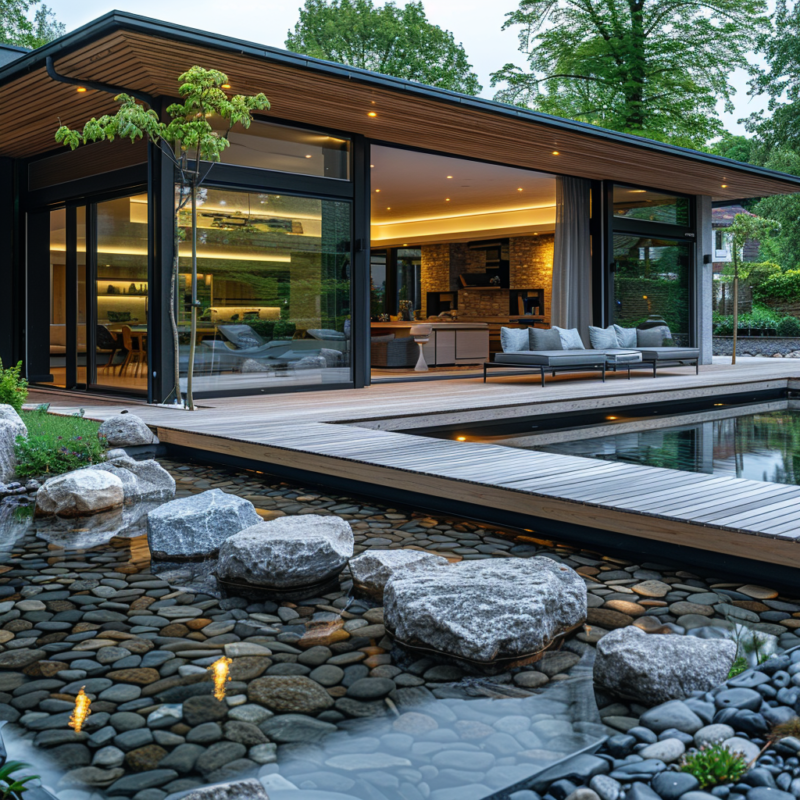 Insgesamt zeigt das Bild ein durchdachtes Konzept, das die Ruhe des Wassers, die Wärme des Holzes, die Festigkeit des Steins und die Leichtigkeit des Glases harmonisch integriert, um einen einzigartigen und friedvollen Außenraum zu schaffen.